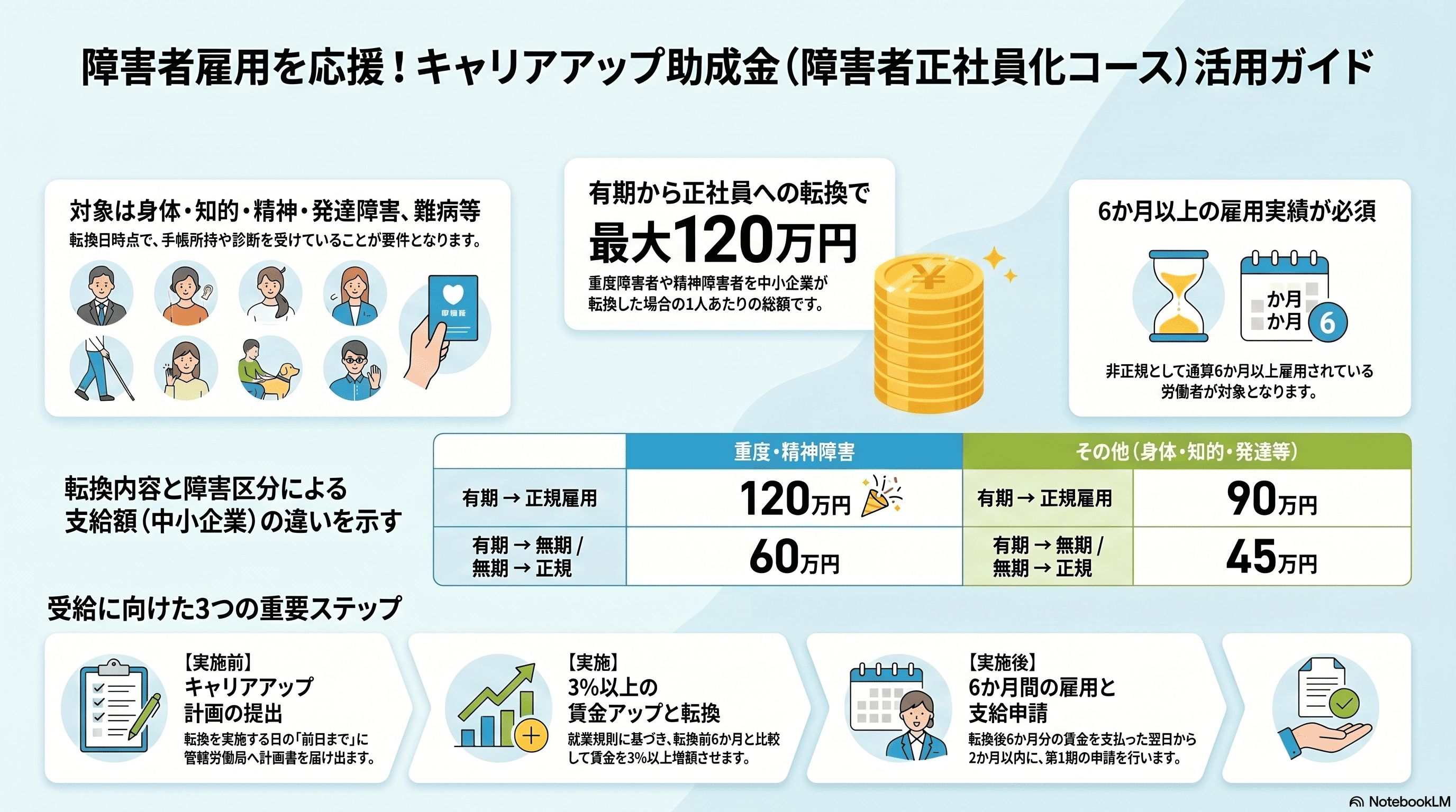 ・一般の正社員化コースで新設された「情報公表加算(20万円)」については、障害者正社員化コースへの適用可否が労働局によって判断が分かれる可能性があるため、申請前の個別確認が必須です。